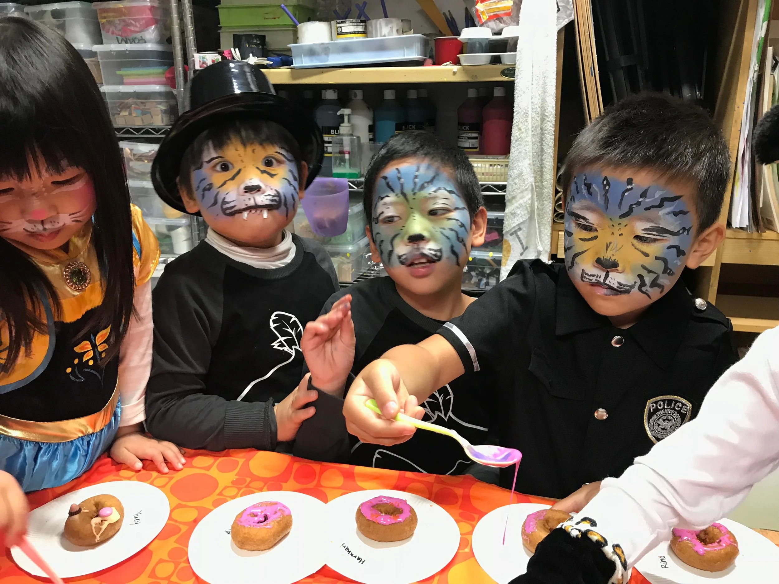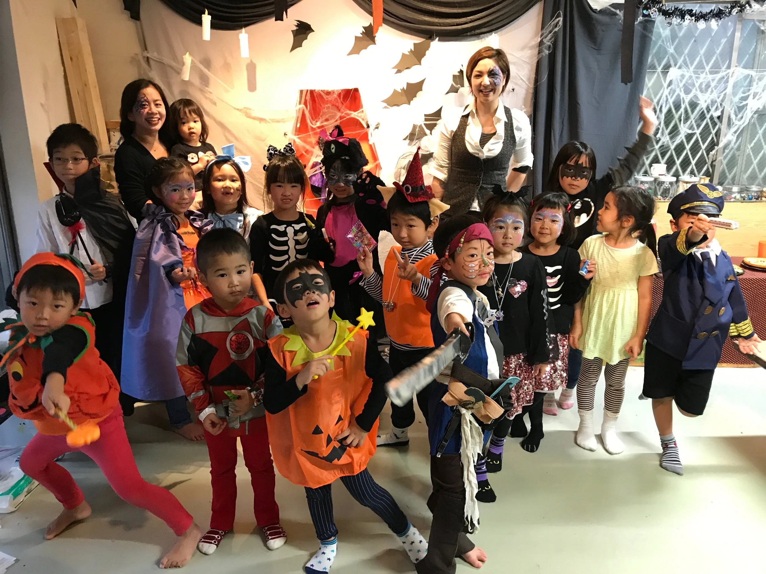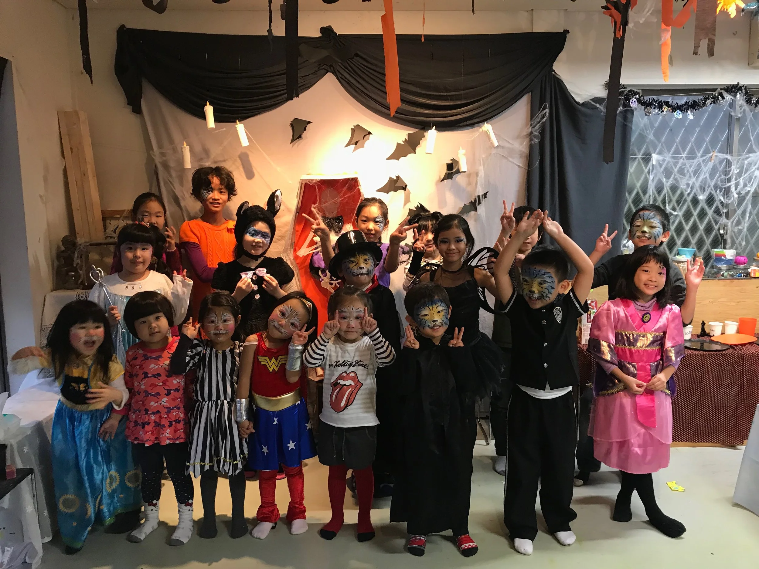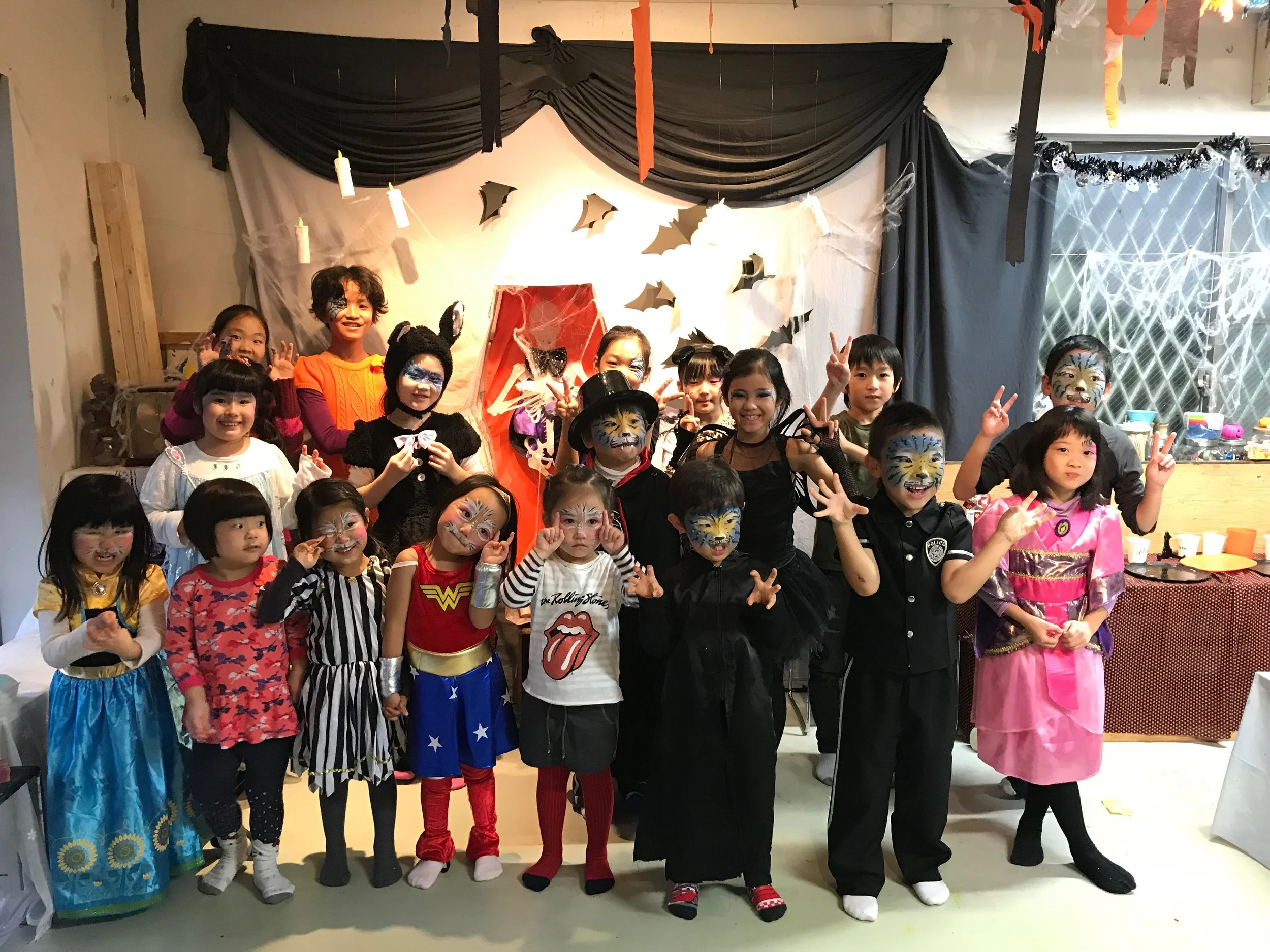 *下記の写真は過去のハロウィンパーティーのときです。ワークショップではフルフェイスペインティングやゲームなどは行いません。